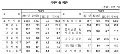 소비지출을 살펴보면 식료품이 625만원으로 전체의 27.1%를 차지했고 뒤를 이어 교육비 339만원(14.7%), 주거비 303만원(13.1%) 등이다. 다만 식료품의 경우 2011년 638만원보다 2.0% 감소했고 교육비 역시 2.9% 줄었다.