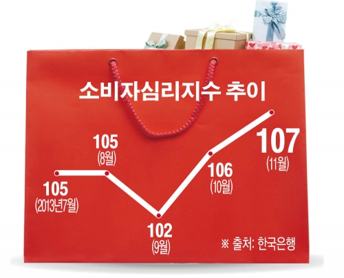한국은행이 26일 발표한 ‘2013년 11월 소비자동향조사 결과’에 따르면 11월 소비자심리지수(CSI)는 107로 전월 대비 1포인트 상승했다. 이는 지난 2011년 2월(109) 이후 최고치다.