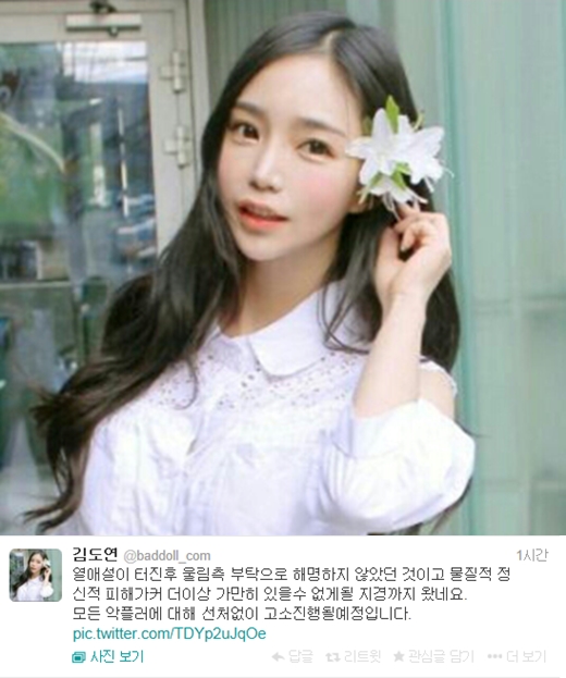앞서 김도연은 이날 새벽 자신의 트위터에서 엘과의 열애가 사실이었음을 밝히고, 악플과 악성루머에 시달린 것에 대해 경찰에 고소장을 접수했다고 전했다.