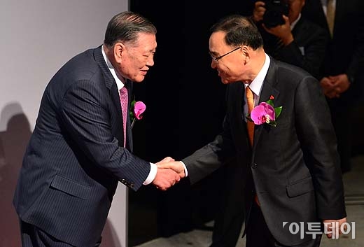 정홍원 국무총리(오른쪽)가 26일 서울 한남동 그랜드하얏트호텔에서 열린 ‘신형 제네시스 신차 발표회’에 참석해 정몽구 현대차 회장과 인사를 나누고 있다. 방인권 기자 bink7119@