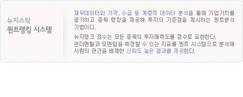 뉴지스탁 퀀트랭킹 시스템을 통해 톱텍이 모멘텀 81점, 펀더멘탈 88점 등 종합점수 84점을 얻어 29일 유망종목에 선정됐다.