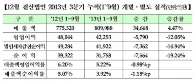 또 개별·별도 재무제표를 제출한 12월 결산법인 960개사 중 비교가능한 896개사를 조사한 결과, 지난 3분기까지 누적 매출액은 80조9988억원으로 전년 동기 대비 4.47% 증가한 반면, 같은 기간 영업이익(4조2253억원)과 순이익(3조1758억원)은 각각 12.05%, 19.24% 감소했다. 이 조사에서는 관리종목·외국기업·스팩(SPAC)·분할합병·결산기변경 기업 등 64개사가 분석 대상에 제외됐다.