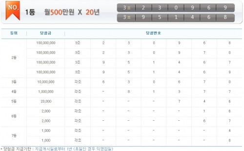5등은 각조 끝자리 746번으로 2만원, 6등은 각조 67번과 16번으로 2000원이 지급된다. 7등은 모든 조의 끝자리 8번과 4번이다.