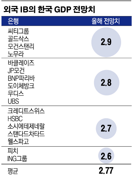 5일 블룸버그와 금융투자업계에 따르면 지난달 28∼29일 기준으로 17개 외국계 IB가 전망한 한국의 올해 GDP 성장률은 평균 2.77%였다. 씨티그룹과 골드만삭스, 모간스탠리, 노무라의 전망치가 2.9%로 가장 높았다. 피치, ING그룹은 2.6%의 낮은 전망치를 제시했다.