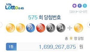 지난 7일 제575회 로또복권 추첨 결과 1등 당첨번호는 ‘2, 8, 20, 30, 33, 34’로 공개됐다. 2등 보너스번호는 ‘6’이다.