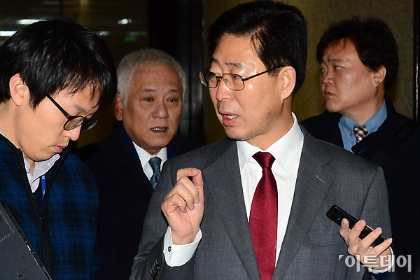 양승조 민주당 최고위원이 10일 오전 여의도 국회 당대표실에서 열린 최고위원회의에 참석하며 취재진의 질문에 답하고 있다. 김한길 대표가 당대표실로 향하며 이를 바라보고 있다. 노진환 기자 myfixer@