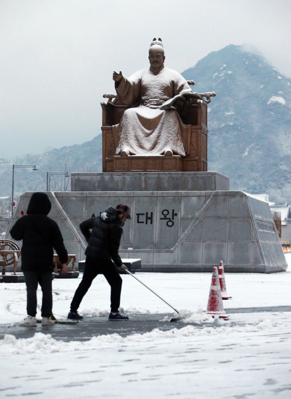 11일 출근길 눈발이 날린 서울 광화문광장 세종대왕상 앞에서 관계자들이 눈을 쓸고 있다.