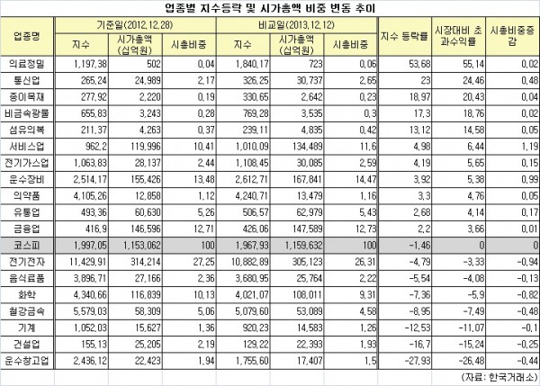 이 밖에 종이목재(35.38%), 운수창고(34.67%), 전기가스(32.37%), 통신(32.22%) 등도 30%가 넘는 극심한 오르내림을 보였다.