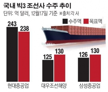 이날 현재 현대중공업은 올해 수주 목표액 238억 달러를 넘어선 243억 달러를 기록했다. 대우조선해양은 목표액 130억 달러의 96% 수준인 125억 달러의 수주를 올렸으며 삼성중공업은 126억 달러를 수주해 목표액 130억 달러에 바짝 다가섰다. 대우조선해양과 삼성중공업은 현재 다수의 수주 협상을 진행 중이어서 연간 목표액 달성은 충분할 것으로 전망되고 있다.