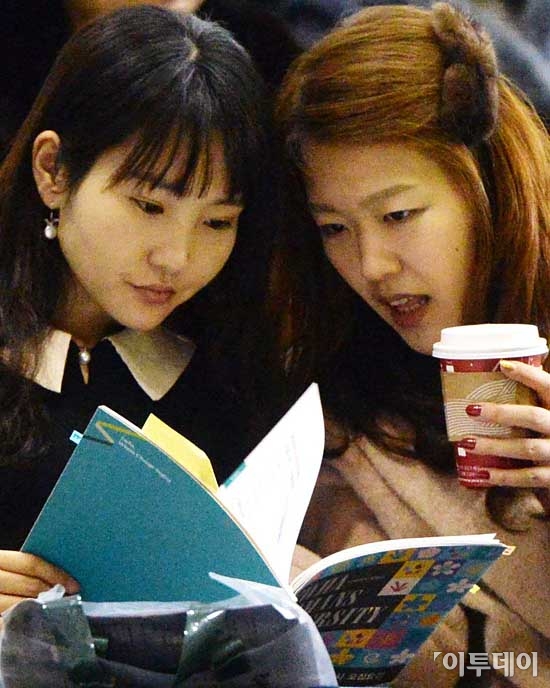 18일 오후 서울 서대문구 이화여자대학교에서 열린 2014학년도 정시모집 입학설명회에서 참석자들이 안내책자를 보며 대화를 나누고 있다. 최유진 기자 strongman55@