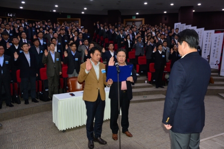 ▲직원 대표로 유신걸 지점장과 김장우 팀장이 투자성향에 맞지 않는 투자권유, 부실한 사후관리 등 5대 고객수익저해요소를 철폐한다는 내용의 선서를 하고 있다.(사진=삼성증권)