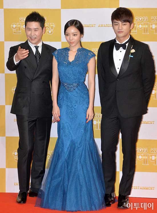 신동엽, 구하라, 서인국(왼쪽부터)가 21일 오후 서울 여의도 KBS신관 TV공개홀에서 열린 KBS연예대상 시상식에 참석해 포토타임을 갖고 있다. 최유진 기자 strongman55@