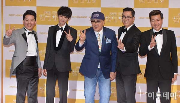 예능프로그램 '1박 2일'팀이 21일 오후 서울 여의도 KBS신관 TV공개홀에서 열린 KBS연예대상 시상식에 참석해 포토타임을 갖고 있다. 최유진 기자 strongman55@