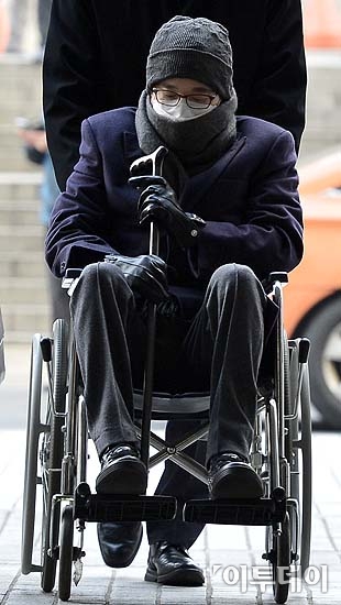 이재현 CJ그룹 회장이 23일 오전 서울 서초동 중앙지방법원에서 열린 횡령과 배임ㆍ조세 포탈 혐의에 대한 2차 공판에 휠체어를 타고 출석하고 있다. 방인권 기자 bink7119@