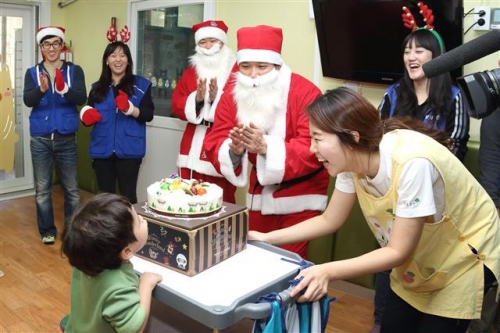 ▲삼성물산은 지난 13일과 20일, 아동 복지시설 4곳에서 산타원정대 봉사활동을 진행했다. 산타로 변신한 삼성물산 임직원들이 아이들과 즐거운 시간을 보내고 있다. (사진=삼성물산)