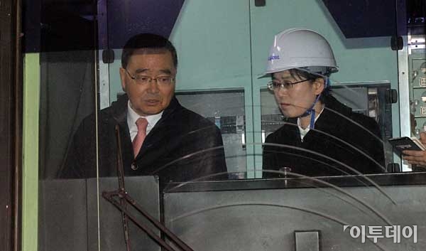 정홍원 국무총리(왼쪽)가 26일 오전 동대문구 이문동 철도차량기지를 방문, 전철에 올라 최연혜 코레일 사장과 대화를 나누고 있다. 최유진 기자 strongman55