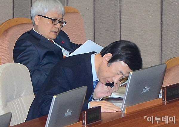 아베 신조 일본 총리가 야스쿠니 신사를 전격 참배한 26일 윤병세 외교부 장관이 국회 본회의장에서 누군가와 통화를 하고 있다. 노진환 기자 myfixer@