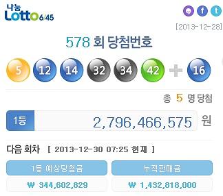 지난 28일 제578회 나눔로또 1등 번호는 5, 12, 14, 32, 34, 42 그리고 보너스 16번으로 총 5명의 당첨자가 나왔다.