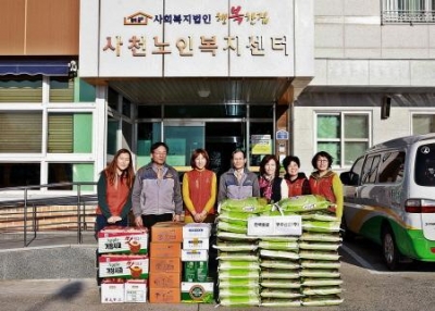 ▲지난 27일 사천시 노인복지센터 '행복한집'에 방문한 KAI 임직원들이 쌀 등을 전달한 후 기념촬영을 하고 있다. 사진제공 한국항공우주산업