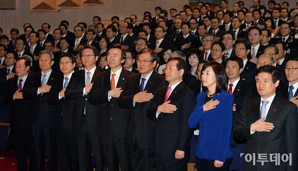 2014년 정부시무식이 2일 오전 서울 세종로 정부청사에서 열려 각 부처 장관들과 공무원들이 국민의례를 하고 있다. 이 날 시무식은 정홍원 국무총리가 참석한 정부세종청사와 정부서울청사를 영상연결, 이원 시무식으로 열렸다. 최유진 기자 strongman55@