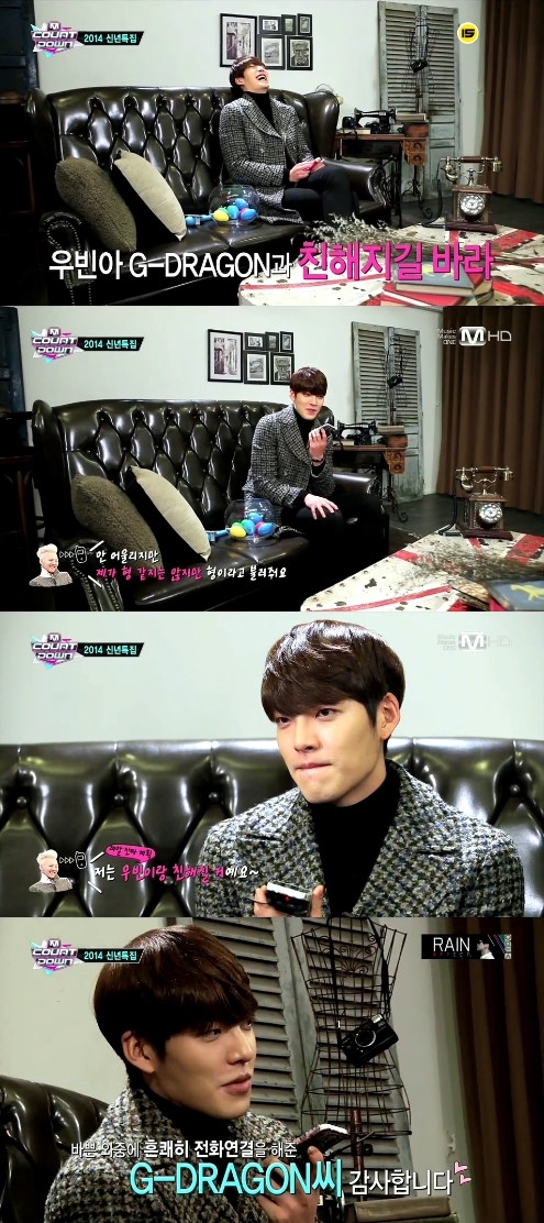 김우빈은 2일 방송된 케이블채널 엠넷 '엠카운트다운'에서 지드래곤과 전화 연결을 시도했다.