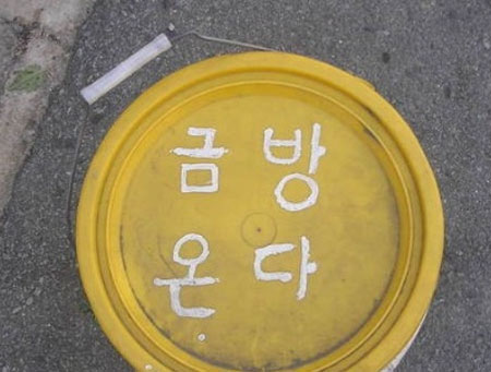 공개된 사진 속에는 물통 뚜껑에 '금방 온다'라는 글씨가 선명하게 적혀 있다.