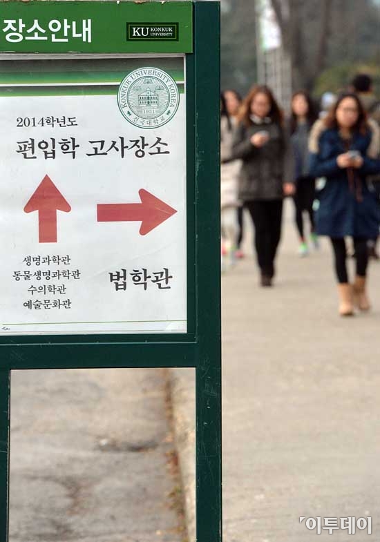 이어지는 취업난속에 보다나은 스펙을 위해 대학생들의 관심이 편입학으로 쏠리고 있다. 7일 오전 2014학년도 편입학 모집을 위한 계열학업능력고사가 실시된 서울 광진구 건국대 서울캠퍼스에서 학생들이 고사장으로 향하고 있다. 최유진 기자 strongman55@