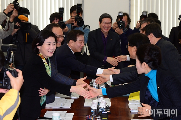 국회 정치개혁특위 교육자치관련법 소위원회가 9일 오전 여의도 국회에서 열려 여야 의원들이 회의 전 악수를 나누고 있다.