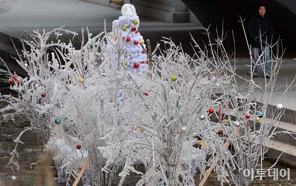 중부·경북·전북내륙 일부 지역에 한파특보가 내려진 13일 오전 서울 청계천에 설치된 조형물에 얼음이 얼어 붙어 추위를 실감케하고 있다. 최유진 기자 strongman55@