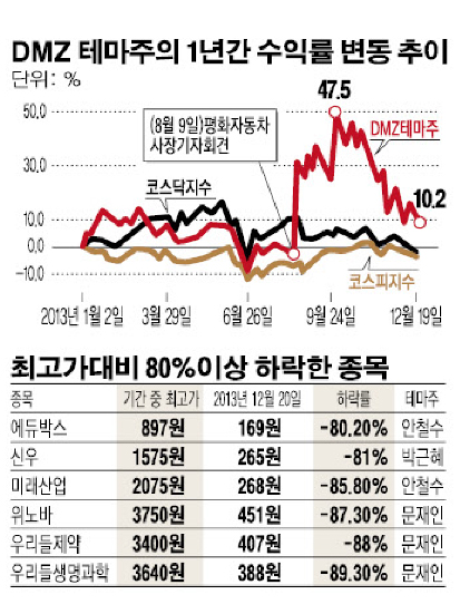 13일 금융감독원은 지난 대선(2012년 12월 19일)후 1년이 지난 지난해 12월 20일까지 정치테마주로 알려진 147개 종목의 수익률 흐름을 분석한 결과 최고 최고 62.2%까지 상승했던 정치 테마주 수익률은 대선 전일 0.1%까지 폭락(2012년 6월 1일 대비)했다고 밝혔다.