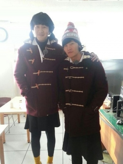 공개된 사진에는 이광수와 김종국이 ‘떡볶이 코트’와 교복 치마를 입은 채 여고생으로 변신한 모습이 담겨 있다. 두 사람은 양갈래와 단발머리 가발을 쓰고 수줍게 웃고 있어 웃음을 주고 있다.