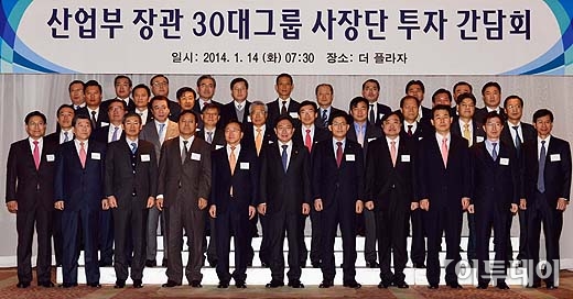 윤상직 산업통상자원부 장관을 비롯한 참석자들이 14일 오전 서울 중구 플라자호텔에서 열린 ‘산업부 장관 30대그룹 사장단 투자 간담회’에서 기념촬영을 하고 있다. 방인권 기자 bink7119@