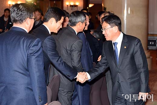 윤상직 산업통상자원부 장관이 14일 오전 서울 중구 플라자호텔에서 열린 ‘산업부 장관 30대그룹 사장단 투자 간담회’에서 참석자들과 인사를 나누고 있다. 방인권 기자 bink7119@