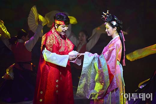 배우 규현(그룹 슈퍼주니어)과 배우 서현(그룹 소녀시대)이 20일 서초동 예술의전당 CJ토월극장에서 열린 뮤지컬 ‘해를 품은 달’ 프레스콜에서 연기를 펼치고 있다. 방인권 기자 bink7119@