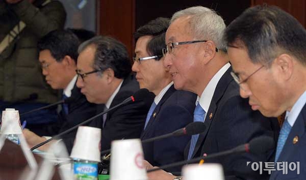 현오석 경제부총리 겸 기획재정부 장관(오른쪽에서 두번째)이 23일 오전 서울 종로구 세종로 정부서울청사에서 열린 대외경제장관회의에 참석, 모두발언을 하고 있다. 최유진 기자 strongman55@