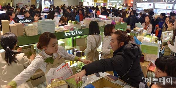 지난 해 서울을 찾은 외국인 관광객 수가 사상 처음으로 천만명을 돌파했다. 서울연구원에 따르면 지난해 한국을 방문한 외국인 관광객은 모두 1천 217만여명으로 여기에 서울방문율 82.5%를 적용하면 1천 4만여명이 서울을 방문한 것으로 추산된다. 23일 오후 서울 중구 소공동 롯데백화점 면세점이 쇼핑을 하는 외국인 관광객들로 붐비고 있다. 최유진 기자 strongman55@