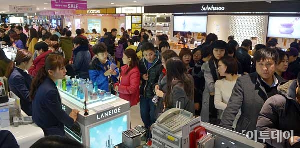 지난 해 서울을 찾은 외국인 관광객 수가 사상 처음으로 천만명을 돌파했다. 서울연구원에 따르면 지난해 한국을 방문한 외국인 관광객은 모두 1천 217만여명으로 여기에 서울방문율 82.5%를 적용하면 1천 4만여명이 서울을 방문한 것으로 추산된다. 23일 오후 서울 중구 소공동 롯데백화점 면세점이 쇼핑을 하는 외국인 관광객들로 붐비고 있다. 최유진 기자 strongman55@