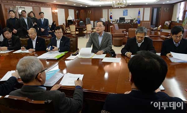 정홍원 국무총리가 26일 오후 서울 종로구 세종로 정부서울청사 총리 집무실에서 AI확산 대책논의를 위한 긴급장관회의를 주재하고 있다. 이날 회의에는 현오석 경제부총리 겸 기획재정부 장관과 이동필 농림축산식품부 장관, 김관진 국방부 장관이 참석했으며 AI 확산과 더불어 카드사 개인정보 유통 차단 방안도 논의됐다. 최유진 기자 strongman55@