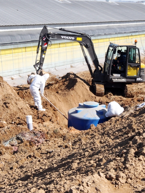 4일 고병원성 조류인플루엔자(AI)가 발생한 충북 진천군의 한 오리농장 살처분 매몰지에서 침출수가 유출돼 처리반이 복구작업을 벌이고 있다.