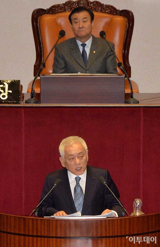 김한길 민주당 대표가 5일 오전 여의도 국회 본회의장에서 열린 제322회 국회(임시회) 제3차 본회의에 참석해 교섭단체 대표 연설을 하고 있다. 최유진 기자 strongman55@