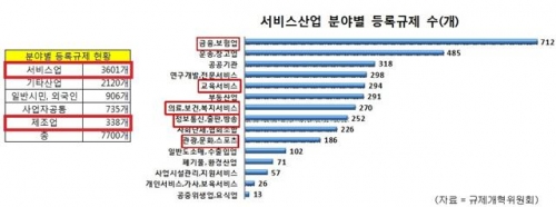 6일 전국경제인연합회가 발표한 규제개혁위원회에 등록된 규제 현황 조사 결과, 전체 7700개의 주된 규제에서 서비스산업 규제는 3601개를 차지했다. 이는 제조업에만 적용되는 규제인 338개와 비교해 10배 이상 되는 수준이다.