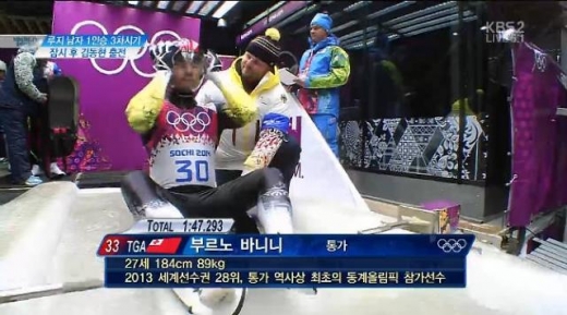 통가 브루노 바나니는 9일(한국시간) 오후 러시아 소치에서 열린 2014 소치 올림픽 루지 남자 1인승 3차 시기 경기에서 2분 40초 455를 기록하며 30위에 올랐다. 자신의 경기 중 최고 기록이다.