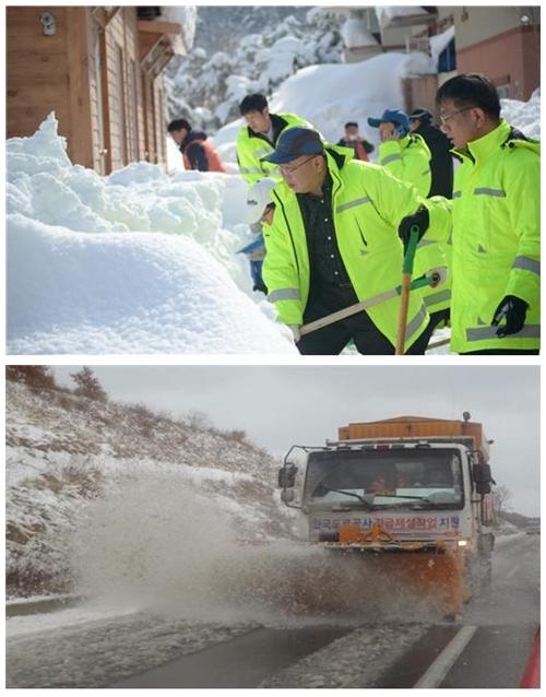 ▲도로공사 직원들이 폭설지역의 마을제설작업을 지원하고 있는 모습(상)과 도로공사 차량이 시가지 도로 제설작업을 진행하고 있는 모습(하)