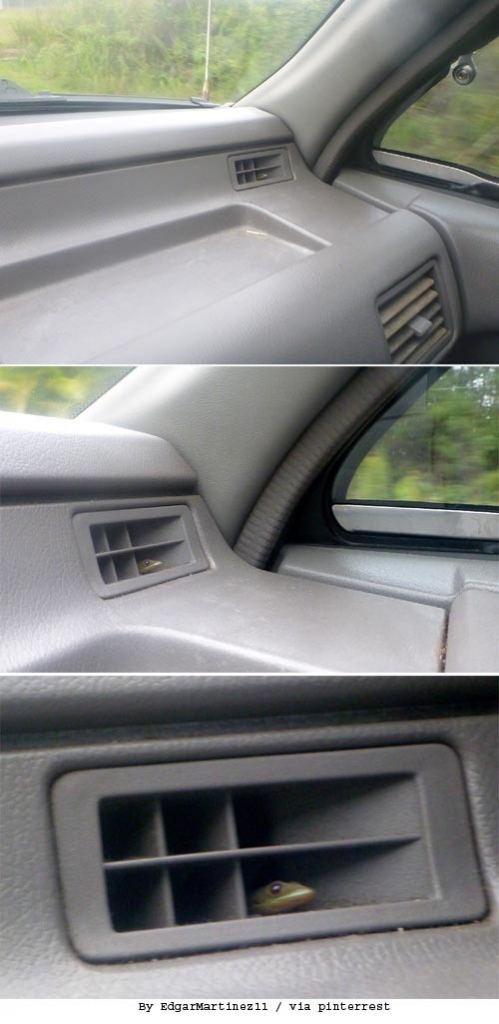 사진에는 차안 환기구에서 빼곰히 고개를 내밀고 있는 작은 도마뱀의 모습이 담겨 있다. 작지만 위협적인 파충류의 모습이 보는이의 공포감을 자아낸다.