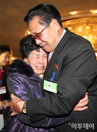 설 계기 이산가족상봉 행사가 20일 오후 금강산호텔에서 열렸다. 단체상봉 행사에서 남측 가족 이선향 할머니(87, 왼쪽)가 북측 가족과 끌어 안고 반가움에 눈물을 흘리고 있다. 이산가족 상봉행사가 열린 것은 지난 2010년 10월 이후 3년 4개월 만이다. 사진공동취재단