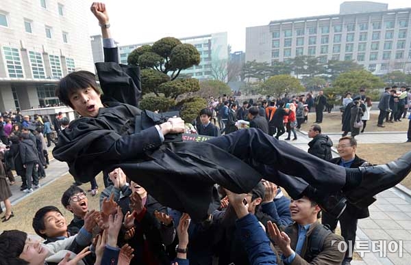 건국대 학위수여식이 열린 24일 서울 광진구 건국대 캠퍼스에서 한 졸업생이 후배들에게 헹가래를 받으며 졸업을 축하받고 있다. 최유진 기자 strongman55@