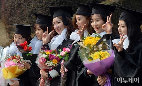 건국대 학위수여식이 열린 24일 오전 서울 광진구 건국대 캠퍼스에서 졸업생들이 환하게 웃으며 사진을 찍고 있다. 최유진 기자 strongman55@