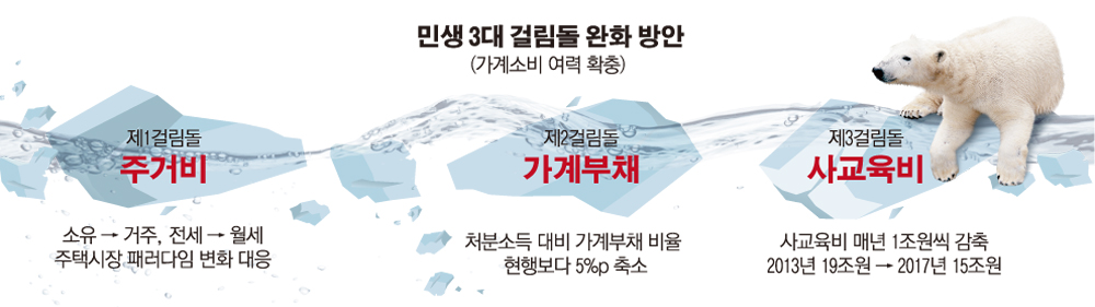 정부가 25일 발표한 ‘경제혁신 3개년 계획’에는 주거비, 가계부채, 사교육비 등 ‘민생의 3대 걸림돌’을 완화하겠다는 내용이 담겨 있다. 이는 가계의 부담을 줄여 소비여력을 늘리는 것은 내수를 활성화한다는 3개년 계획의 큰 방향과도 맞닿아 있다.