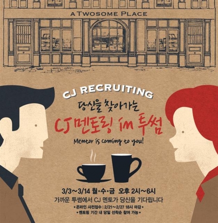 행사는 신촌점ㆍ광화문점ㆍ서울대점ㆍ고려대법학관점 등 서울지역 4곳을 포함해 대구 영남대점, 부산대 정문점, 광주 용봉CGV점, 대전 우송대점 등 전국 총 8개 투썸 매장에서 진행된다. 오는 27일까지 CJ그룹 채용 홈페이지(recruit.cj.net)를 통해 사전 신청을 받는다. 행사 당일 오후 2시부터 현장에서 신청할 수도 있으며, 오후 4시부터 6시까지 선착순으로 상담이 진행된다.