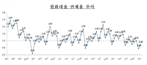 27일 금융감독원에 따르면 1월 말 국내은행의 원화대출 연체율(1일 이상 원금연체 기준)은 0.98%로 전월 말(0.89%)에 비해 0.09%포인트 상승했다.